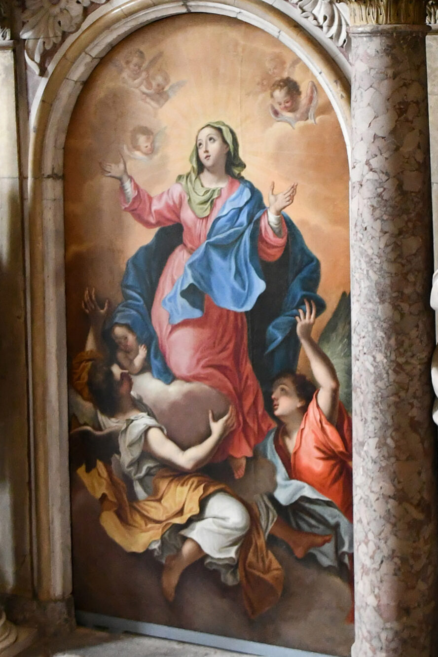 In ikonographischer Hinsicht folgt das Gemälde der zweiten klassischen Darstellungsvariante der Aufnahme Mariens, bekannt als „La Asunta“: Maria erscheint allein, umgeben von Engeln, ohne Apostel oder leeres Grab. Diese Wahl spiegelt die theologischen Überlegungen der Verantwortlichen nach dem Konzil von Trient wider, als diskutiert wurde, ob die Apostel tatsächlich Zeugen des Mysteriums der Himmelfahrt gewesen seien.