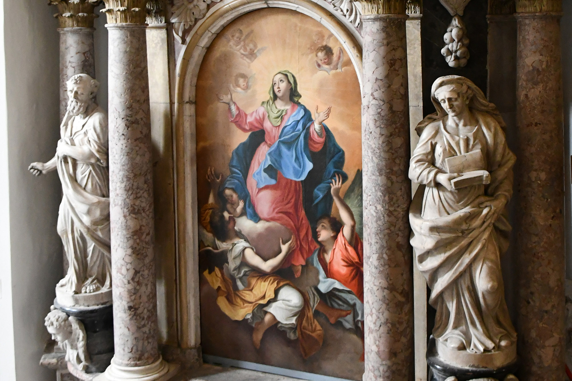 Die architektonische Gestaltung des Altars zeigt eine ruhige barocke Komposition aus hellrosafarbenem Marmor, mit zwei Säulenpaaren, die die Nische des Altarbildes einrahmen. Links und rechts der Nische stehen die Skulpturen von Joachim und Anna, den Eltern der Jungfrau Maria, deren Fest am 26. Juli gefeiert wird. Diese Skulpturen wurden 1720 vom venezianischen Bildhauer Jacopo Contieri geschaffen. Seine Signatur erscheint als I.C.S. auf dem Sockel der Figur von Joachim und als IACO.S CONTIERUS SCVL. auf dem Sockel der Statue von Anna.
