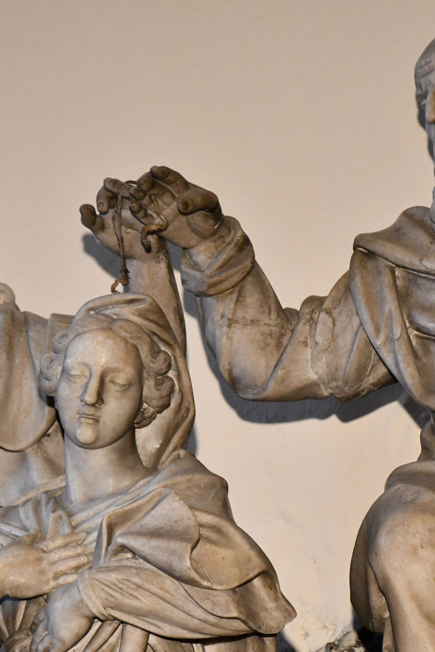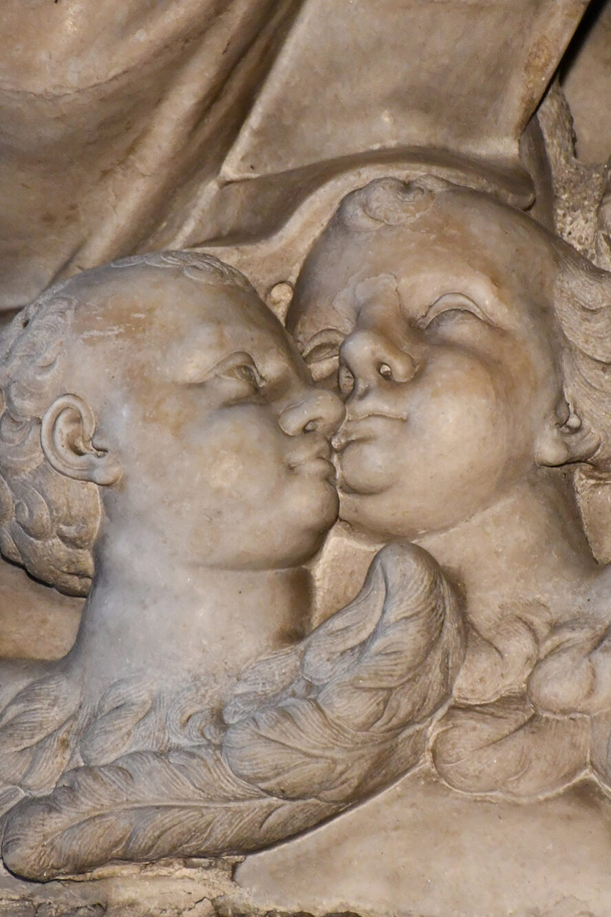 Ebenfalls von Contieri stammen die Engelsfiguren an den Seiten des Aufsatzes, die ein Band mit der lateinischen Inschrift halten: