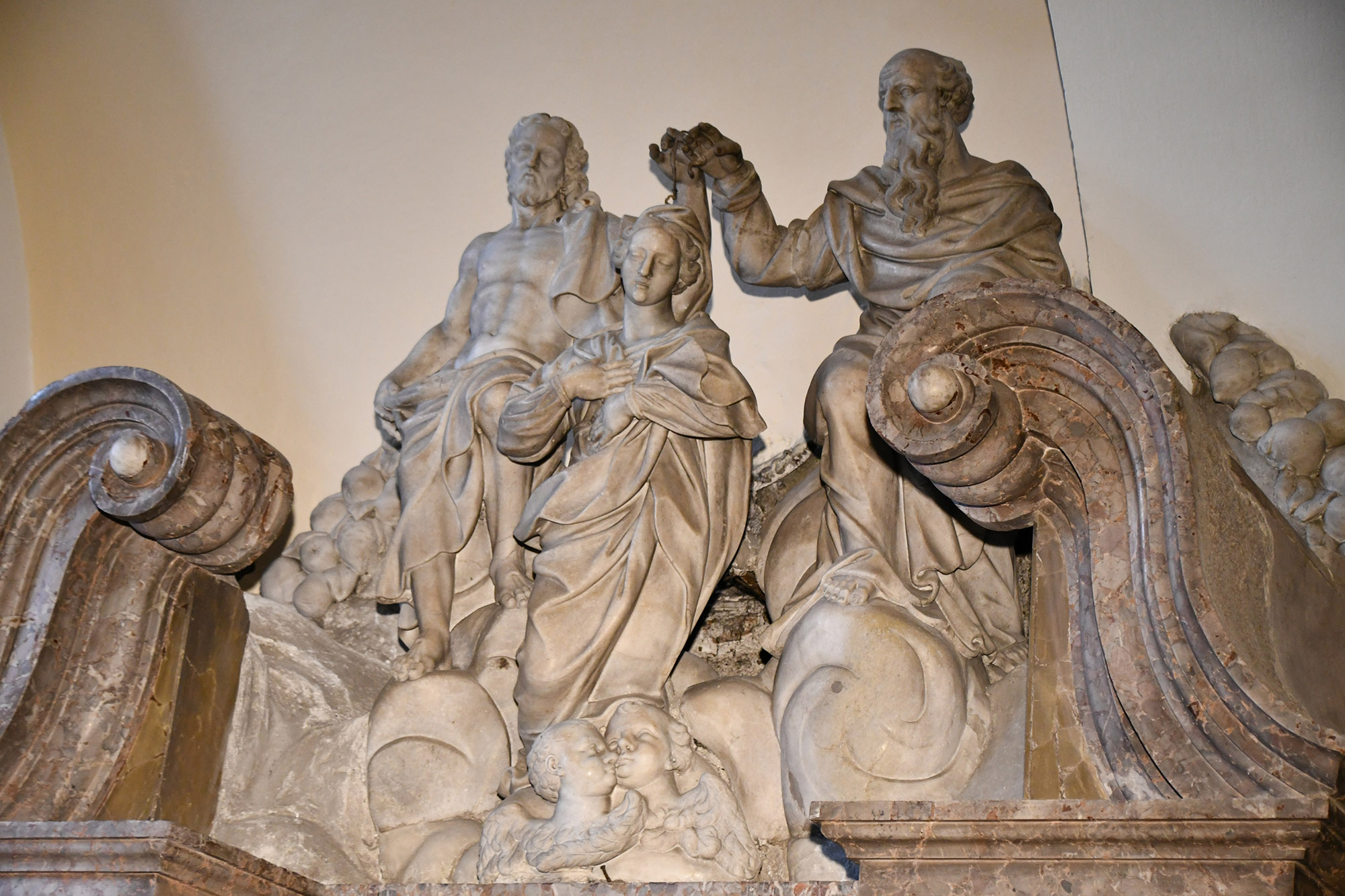 Die Skulpturengruppe der Krönung Mariens, die sich im Aufsatz befindet, gilt als das erste dokumentierte Werk von Francesco Robba in Ljubljana. Robba kam als Assistent von Contieri in die Stadt und wurde später zu der zentralen Figur der barocken Bildhauerei in Krain.