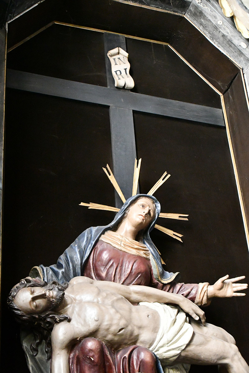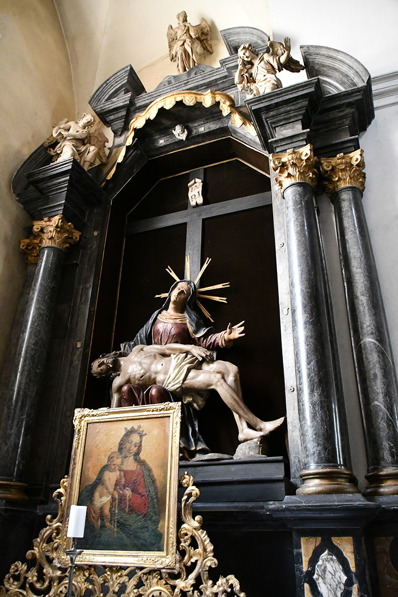 Im Inneren der Nische steht eine Skulptur der Schmerzhaften Muttergottes (Pietà), die jedoch nicht mehr das Original ist. Die heutige Statue stammt aus dem 19. Jahrhundert und ersetzt eine ältere, bewahrt jedoch das zentrale Motiv der trauernden Maria mit ihrem gekreuzigten Sohn. Über dem Aufsatz befindet sich eine zentrale Engelsfigur, flankiert von zwei knienden Engeln unter einem kleinen hölzernen Baldachin – barocke Ergänzungen aus dem 18. Jahrhundert, die den emotionalen Ausdruck und den künstlerischen Charakter des Altars verstärken. Unterhalb der Mensa befindet sich ein Gemälde der trauernden Maria Magdalena, datiert auf die Mitte des 18. Jahrhunderts.