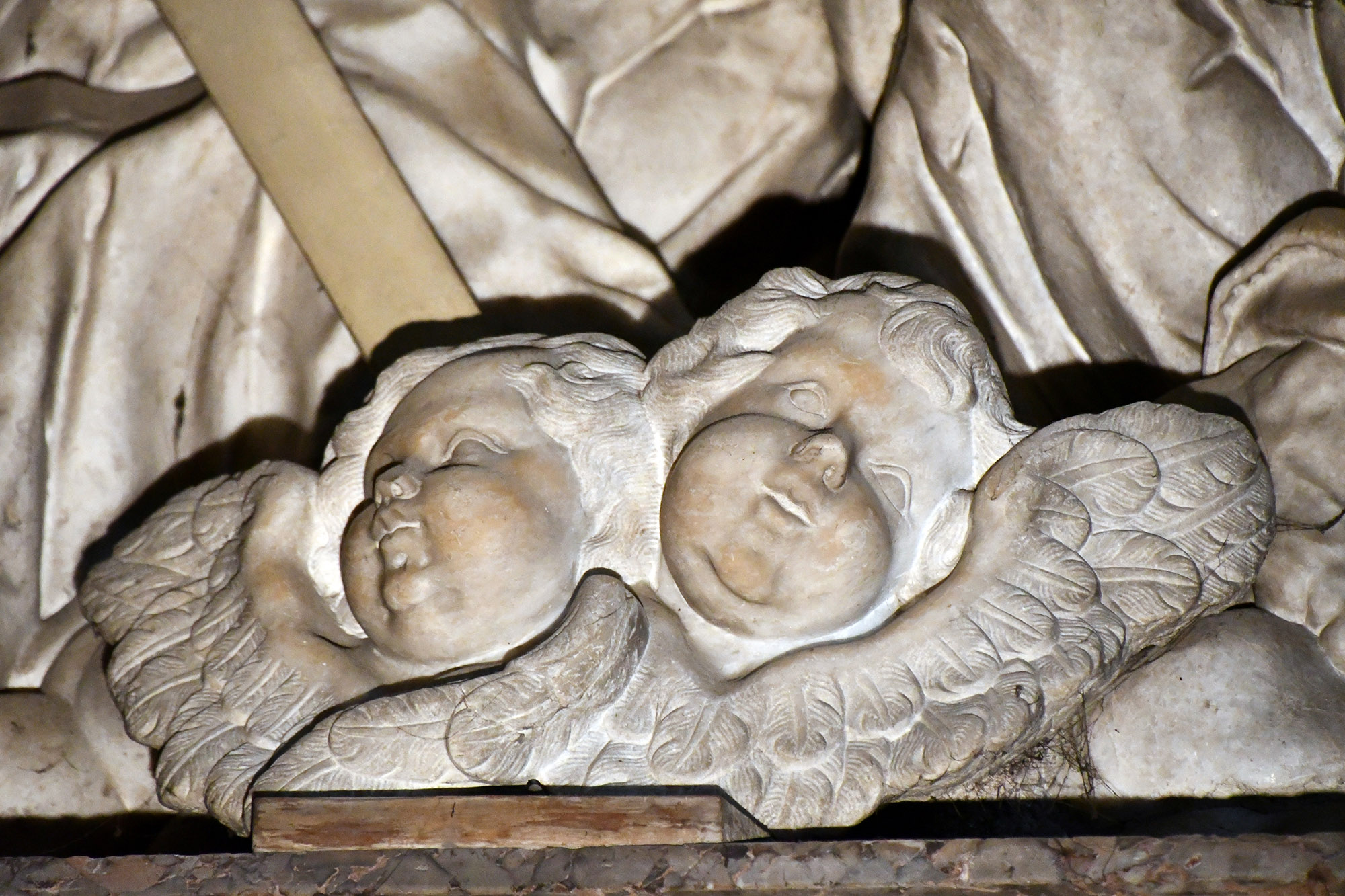 Vor dem Altarbild stehen die Statuen des hl. Stanislaus Kostka und des hl. Aloisius von Gonzaga, gefertigt vom paduanischen Bildhauer Angelo Putti. Die starre Haltung der Figuren lässt darauf schließen, dass beide Heilige zum Zeitpunkt der Errichtung des Altars noch nicht kanonisiert waren – ihre gemeinsame Heiligsprechung erfolgte erst 1726. Über den Säulen halten zwei Engel ein Spruchband mit der lateinischen Inschrift:
