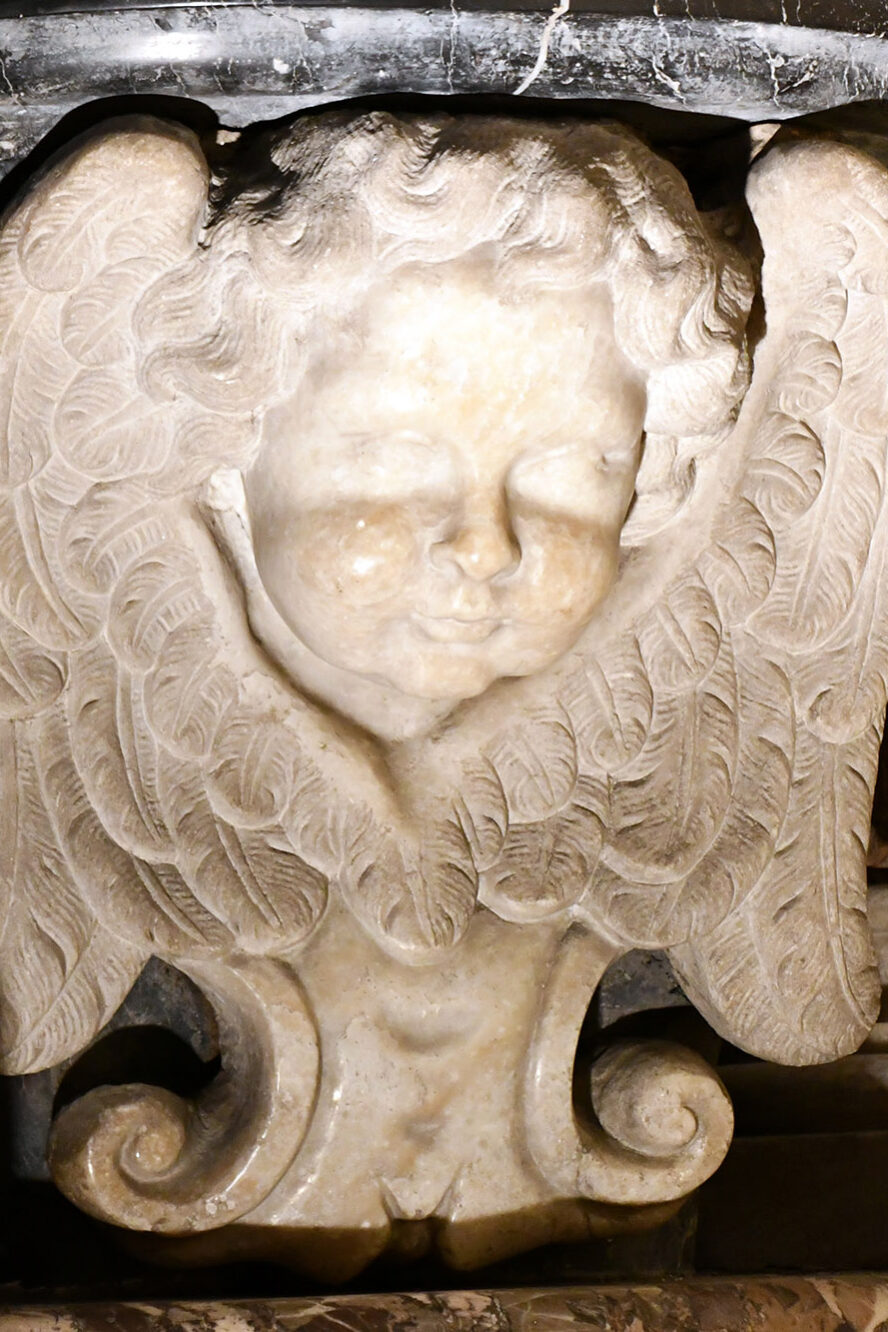 Der Altar besteht aus zwei glatten Säulen aus rosafarbenem Marmor und zeichnet sich durch eine ruhige Architektur mit profiliertem Gebälk und einem von Voluten gekrönten Abschluss aus. Die Mensa (Altartisch) ist prismatisch geformt, mit zwei stehenden Engeln und reicher pflanzlicher Ornamentik geschmückt; im Zentrum befindet sich eine Kartusche mit dem Christus-Monogramm IHS.
