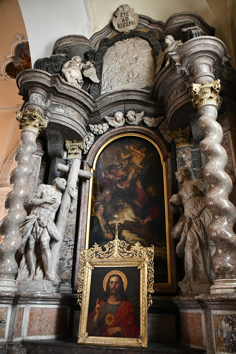 Die Architektur ist eindeutig barock, reich an visuellen Reizen und räumlich dynamisch. Der Altar besteht hauptsächlich aus mehrfarbigem und importiertem schwarzem Marmor und enthält weiße Marmorskulpturen, die einen starken Kontrast schaffen. Zwei salomonische Säulen auf geschwungenen Basen dominieren die Komposition und betonen die Tiefe des Altars. Diese Säulen tragen gemeinsam mit Pilastern ein reich verziertes Gebälk und ein Aufsatzgeschoss, das von Voluten eingerahmt ist und von einer Kartusche mit der Inschrift „ITE AD IOSEPH“ (Geht zu Josef) bekrönt wird. Der altarartige Tisch, konvex geformt, ist mit pflanzlichen Volutenmotiven verziert und trägt ein Reliefmedaillon des hl. Josef mit dem Jesuskind.