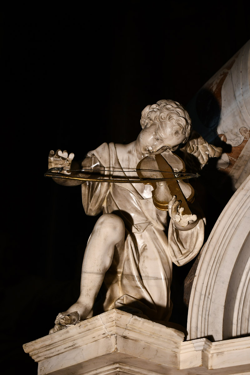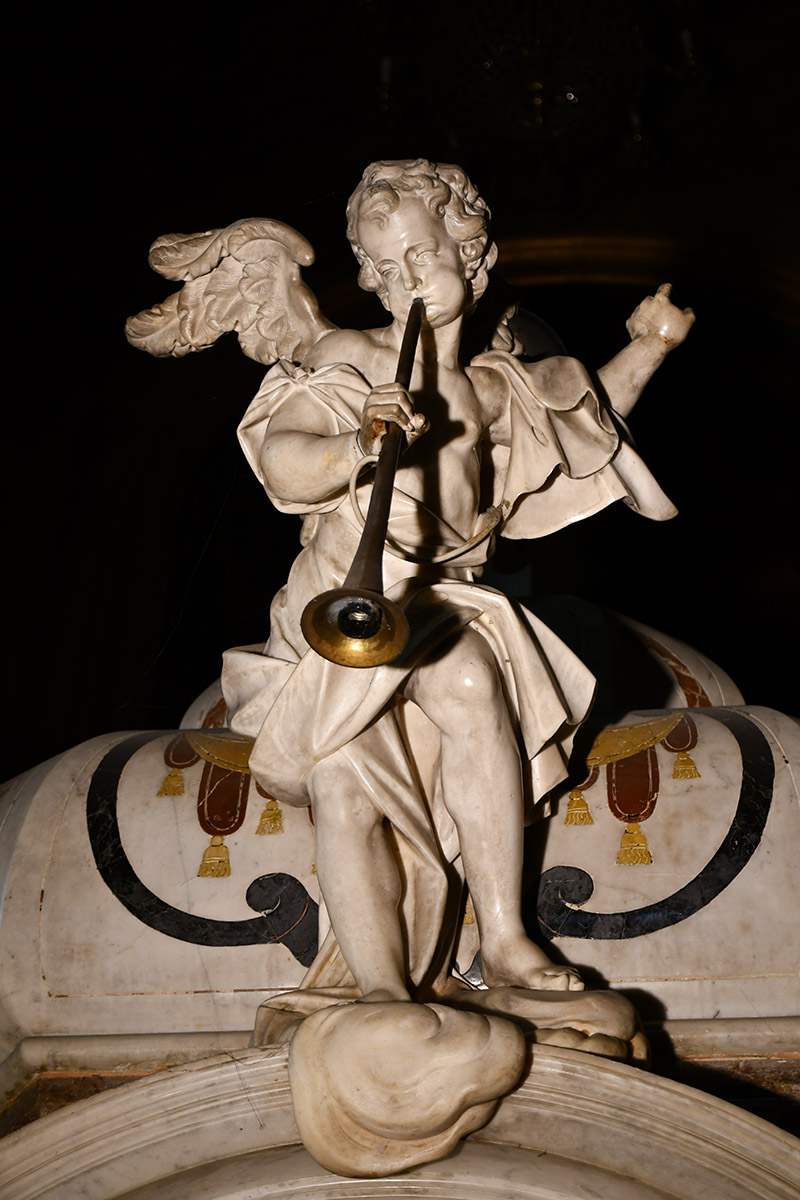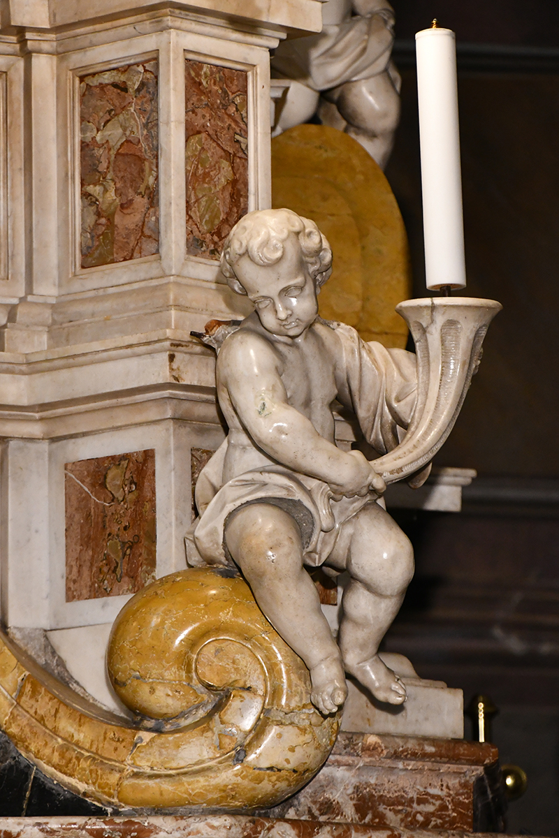 Der Tabernakel ist reich verziert und wird von einer Gruppe musizierender Engel bekrönt. Unter ihnen befinden sich fünf musizierende Putti: zwei vorne mit Geige und Laute, zwei hinten mit Zinken, sowie einer oben mit einer Posaune – sie symbolisieren den fortwährenden Lobpreis Gottes.