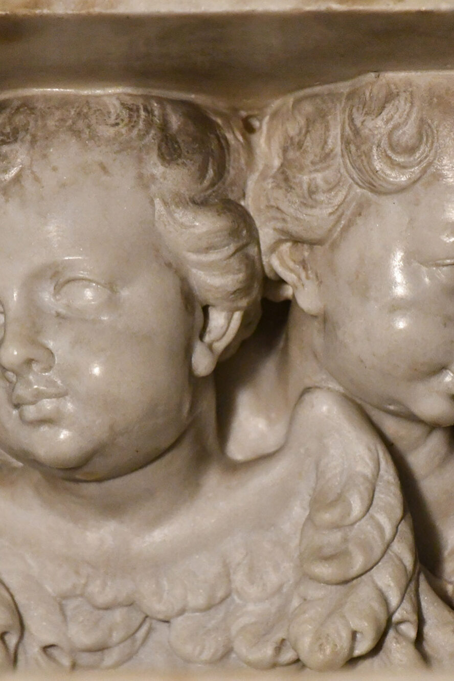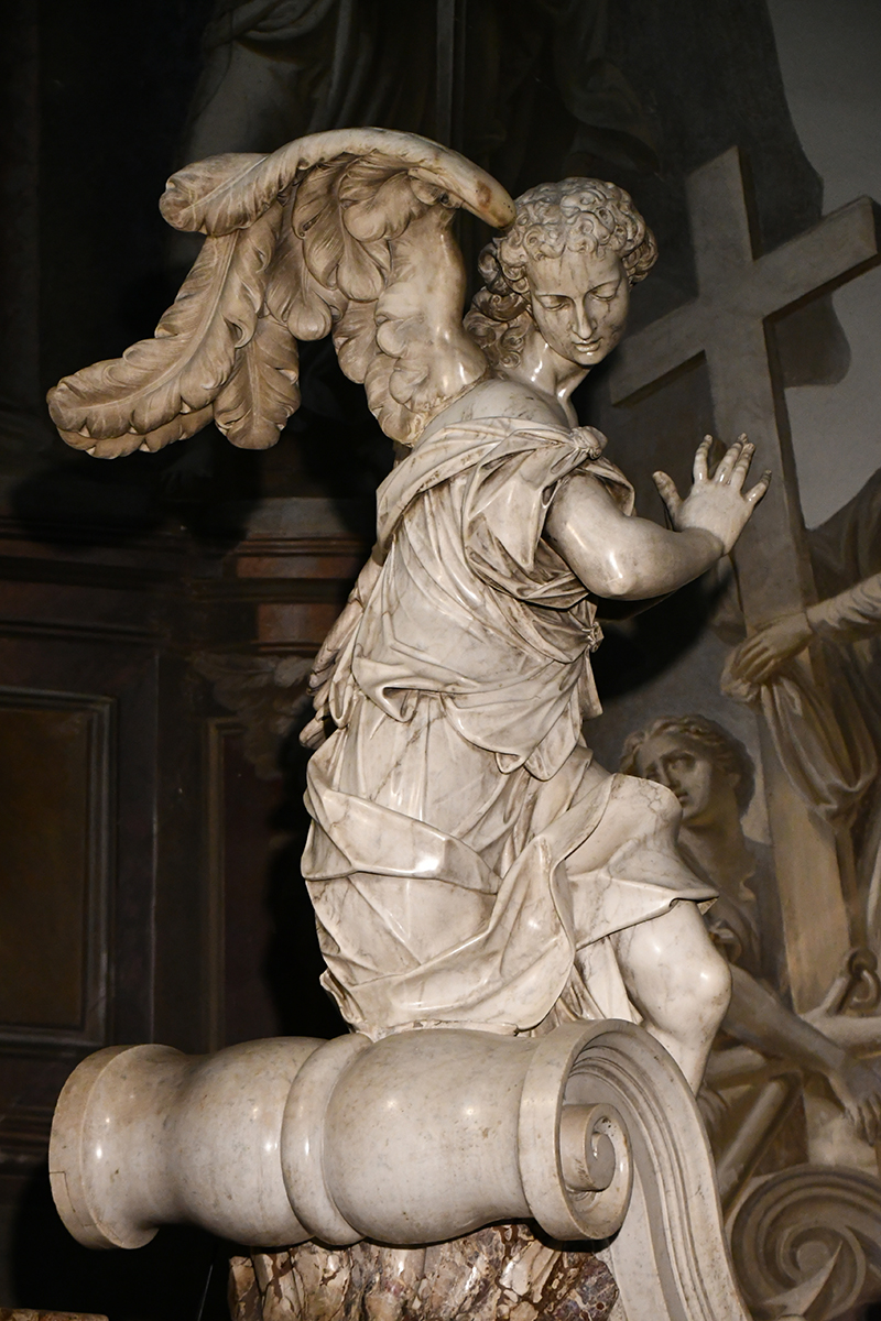 Der Altar ist als Tabernakelstruktur konzipiert, geprägt durch eine komplexe Komposition und den prachtvollen Einsatz von farbigem Marmor. Verziert ist er mit siebzehn Skulpturen aus hochwertigem Carrara-Marmor. Besonders herausragend sind zwei monumentale anbetende Engel, die sich zu beiden Seiten des Altars befinden. Ihre sanft ausgestreckten Flügel und ehrfürchtig geneigten Köpfe vermitteln den Eindruck eines zarten Herabsinkens zur Verehrung des Allerheiligsten im Tabernakel. Ihre Haltung mit gefalteten Händen in kontemplativem Gebet drückt tief empfundene spirituelle Hingabe aus.