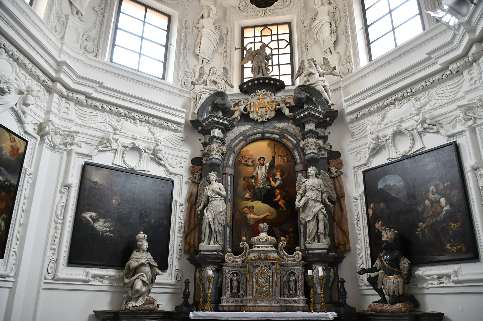 El elemento central es la mensa, sostenida por cuatro figuras de jóvenes africanos, sobre la cual yace la imagen de San Francisco Javier en hábito sacerdotal —no representado en agonía, sino ya difunto— en memoria de sus reliquias incorruptas, que desde 1637 se conservan en Goa.
