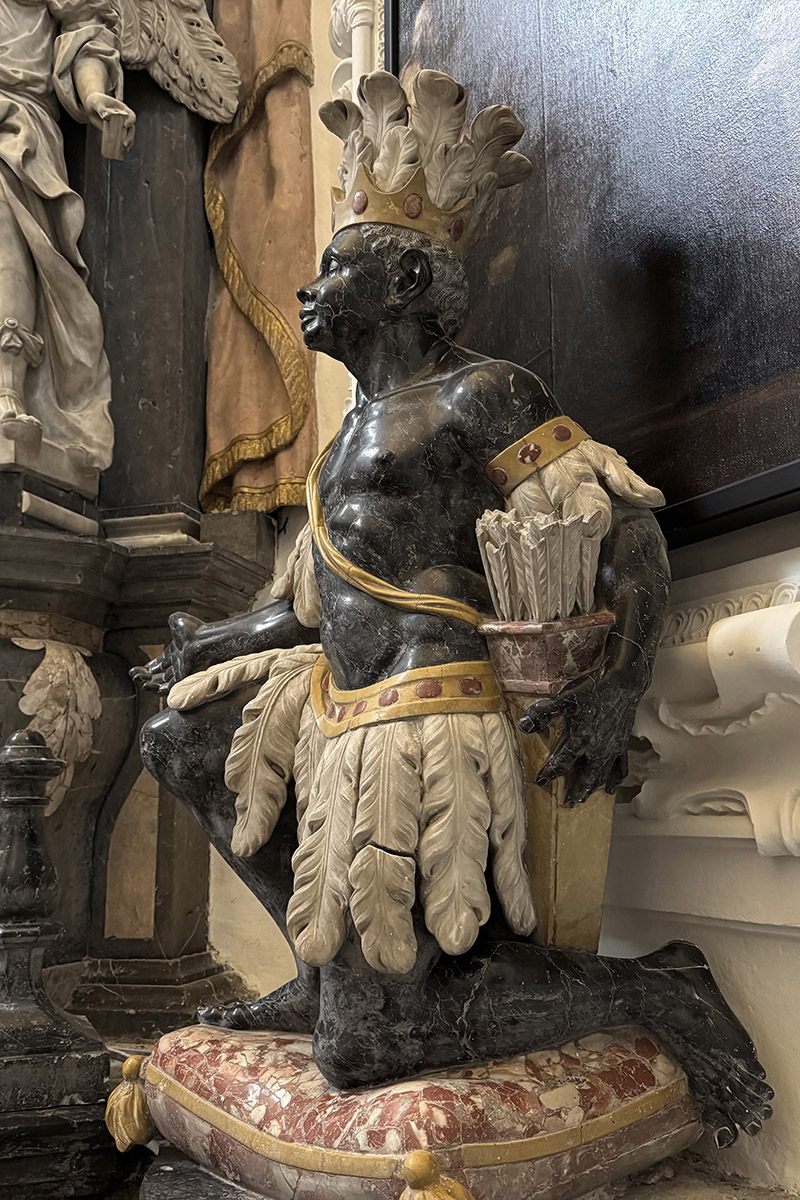El tabernáculo de piedra negra fue ampliado en 1719 con dos nichos de mármol que albergan ángeles tallados por Jacopo Contieri. Este artista también añadió las figuras simbólicas de Europa y África: una “reina” de piel clara y un “rey” de piel oscura, representando la expansión del Evangelio a todos los continentes. Las bases de estas figuras llevan las firmas grabadas de Contieri.