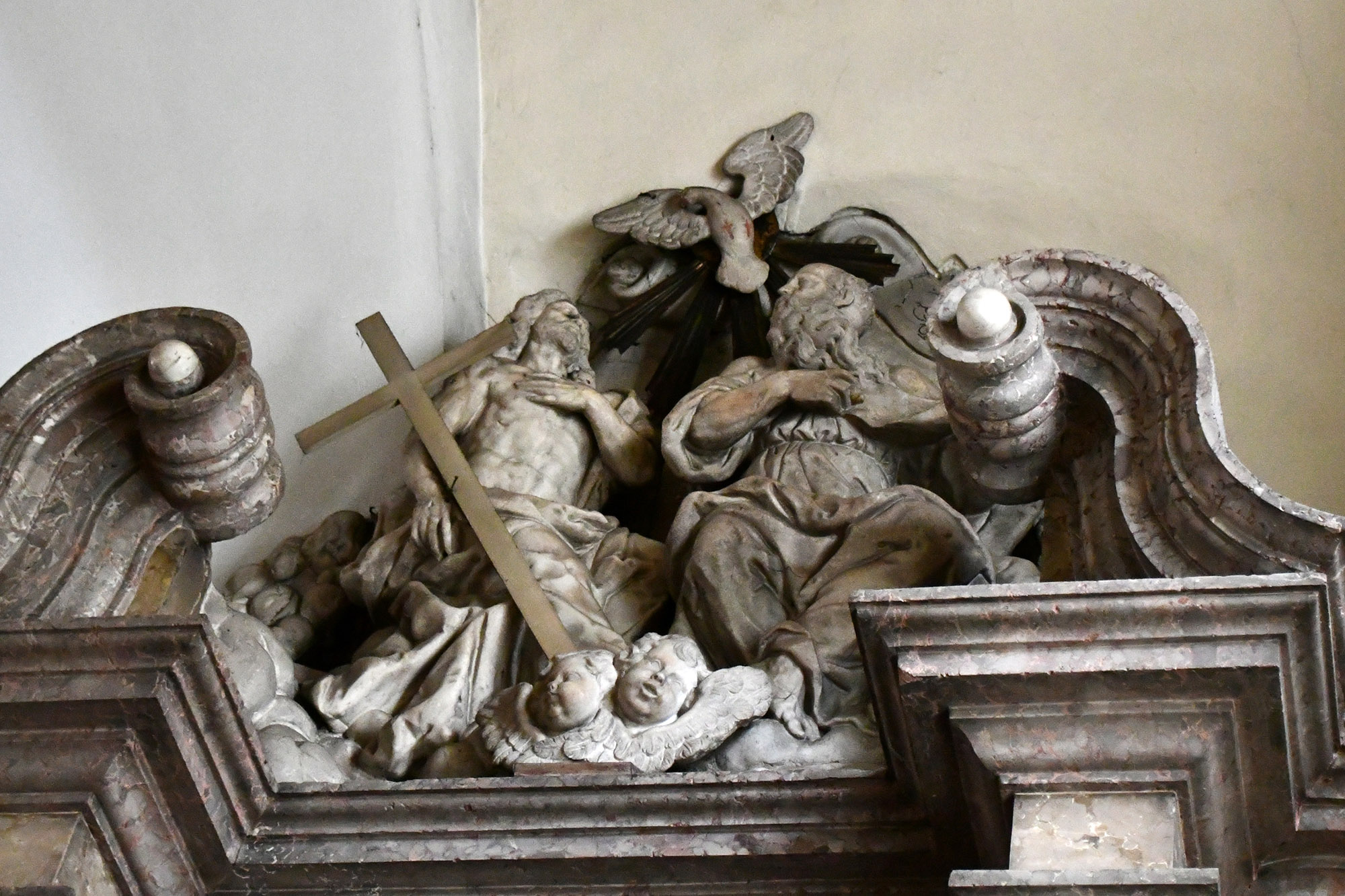 En el ático del altar se encuentra un grupo escultórico que representa a la Santísima Trinidad: Dios Padre, Cristo y el Espíritu Santo en forma de paloma.