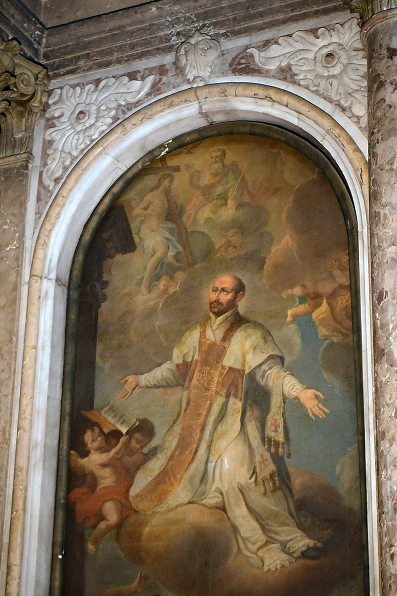 La pintura original del altar, dedicada a San Ignacio, fue obra del veneciano Niccolò Bambini, pero ya en 1732 fue reemplazada por la que se conserva actualmente, realizada por Johannes Veit Hauchka. San Ignacio aparece representado como sacerdote, con el monograma IHS en el pecho, arrodillado sobre una nube, y con las manos alzadas hacia el cielo. En el libro abierto ante él se lee el lema ignaciano: Ad maiorem Dei gloriam – “Para mayor gloria de Dios”.