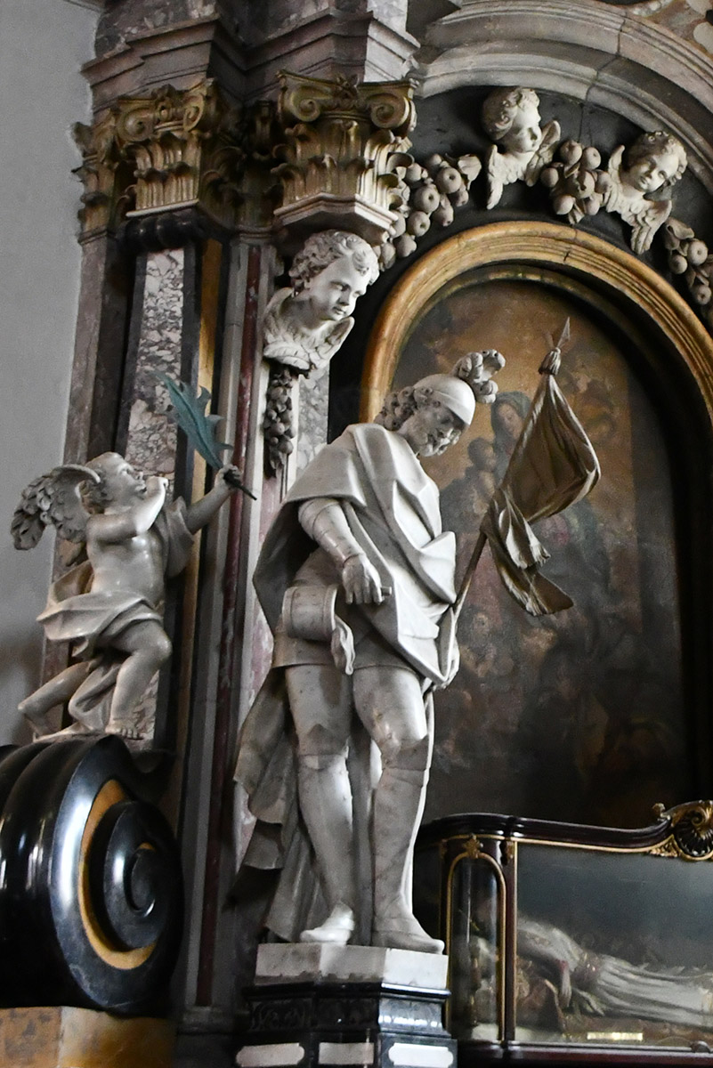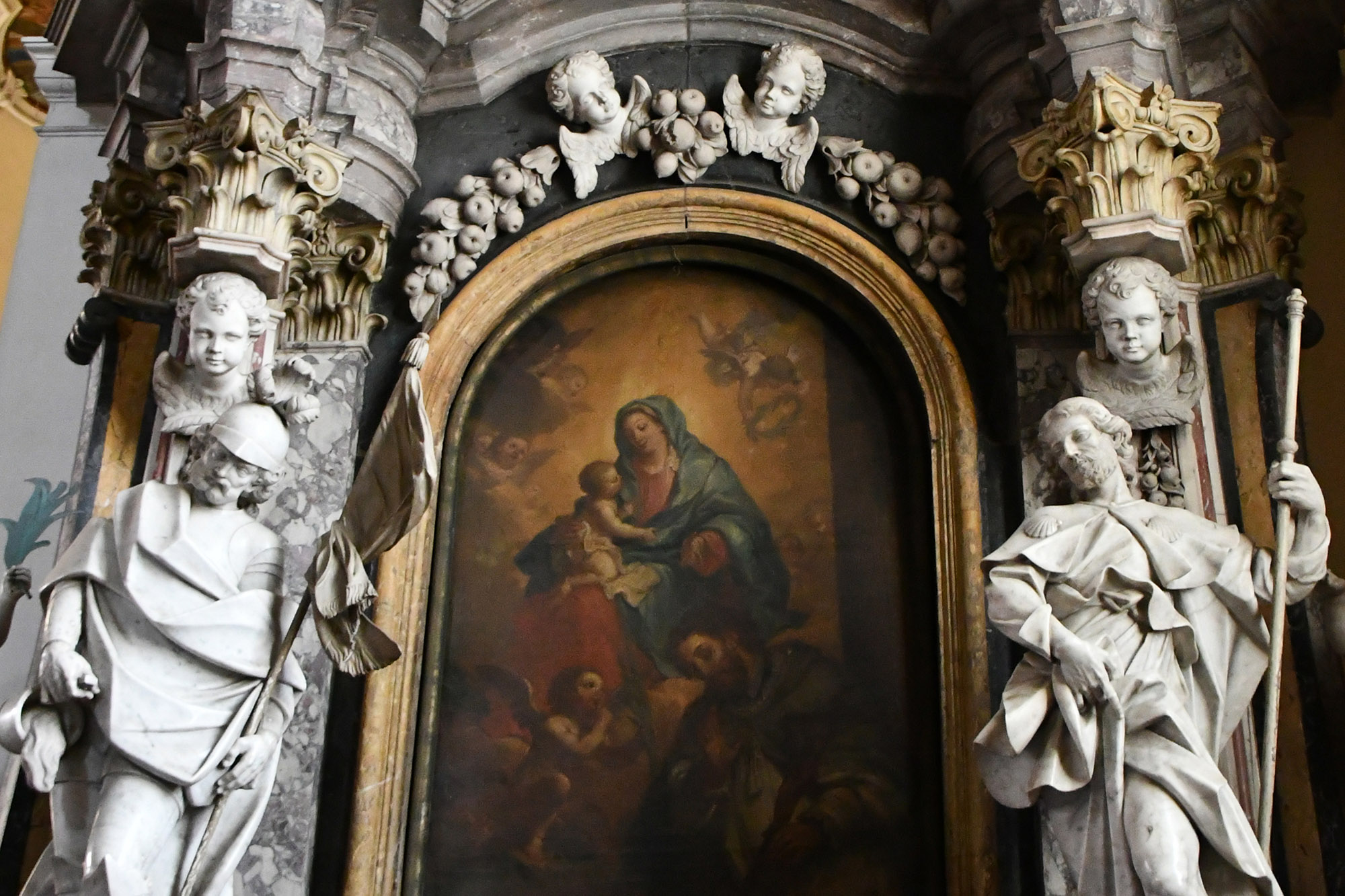 En el ático del altar se halla una pintura de Valentin Metzinger que representa a los mártires jesuitas de Nagasaki (1597). La imagen central, que muestra a la Virgen María junto a San Juan Nepomuceno, fue realizada en Venecia en 1721, probablemente por un pintor del taller de Letterini.