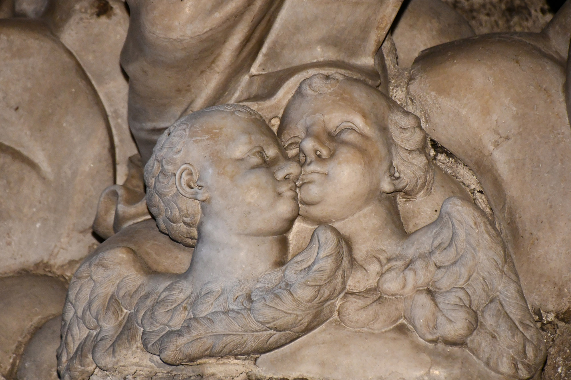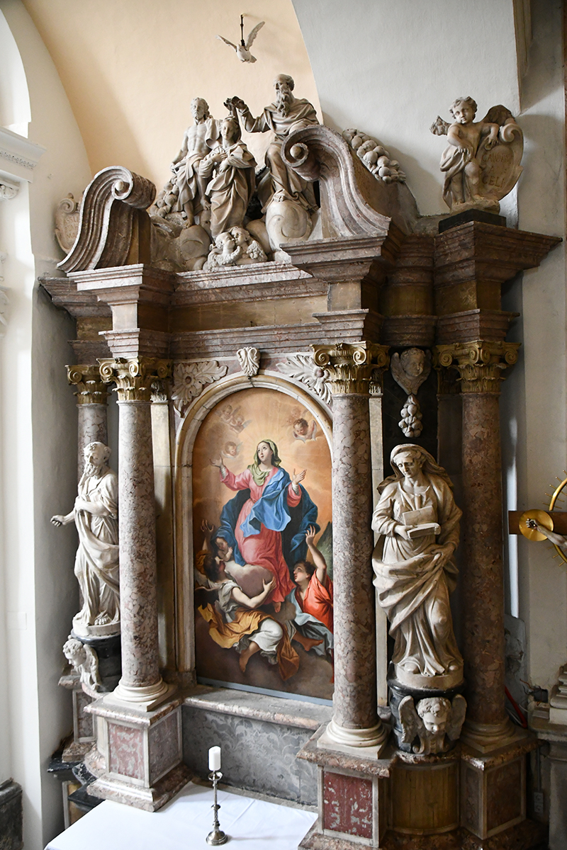Les figures d’anges aux extrémités de l’attique, tenant un ruban portant l’inscription latine ASSUMPTA EST MARIA / GAUDENT ANGELI (« Marie a été enlevée au ciel / Les anges se réjouissent »), sont également l’œuvre de Contieri.