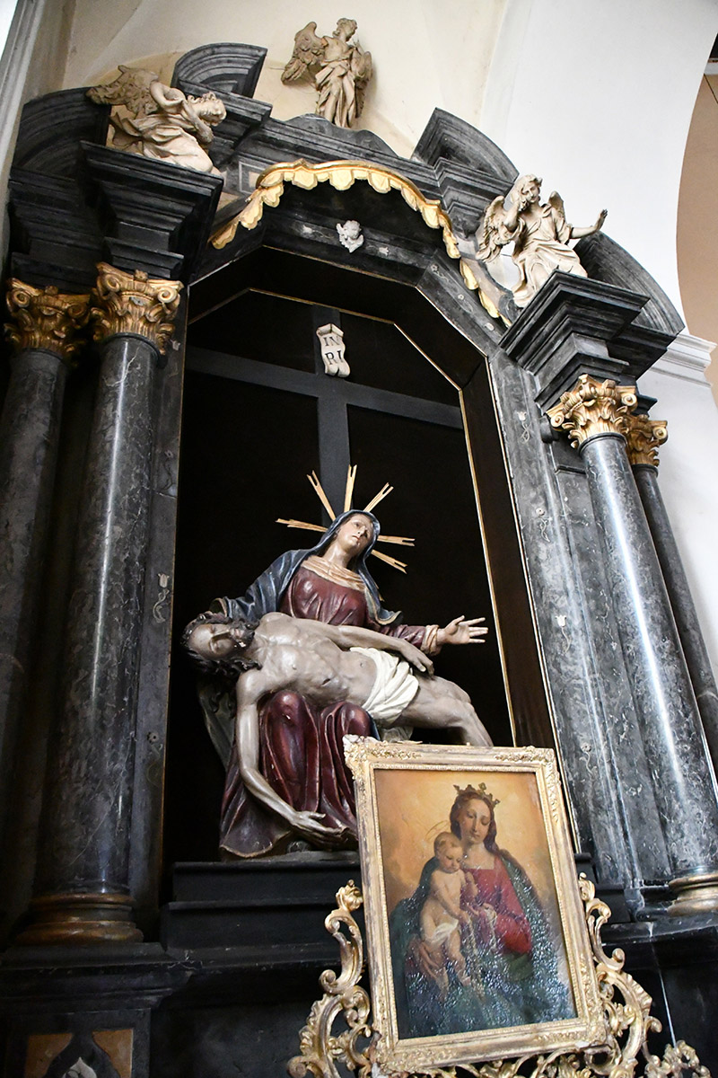 À l’intérieur de la niche se trouve la sculpture de la Vierge des Douleurs (Pietà), qui n’est plus l’originale. L’actuelle statue du XIXe siècle remplace une version plus ancienne, mais conserve le motif essentiel de Marie pleurant son Fils crucifié. Sur l’attique se trouve une figure centrale d’ange, encadrée par deux anges agenouillés sous un petit baldaquin en bois – des ajouts baroques du XVIIIe siècle qui enrichissent l’expression émotionnelle et le caractère artistique de l’ensemble. Sous la mensa, on trouve une peinture de sainte Marie-Madeleine en deuil, datée du milieu du XVIIIe siècle.
