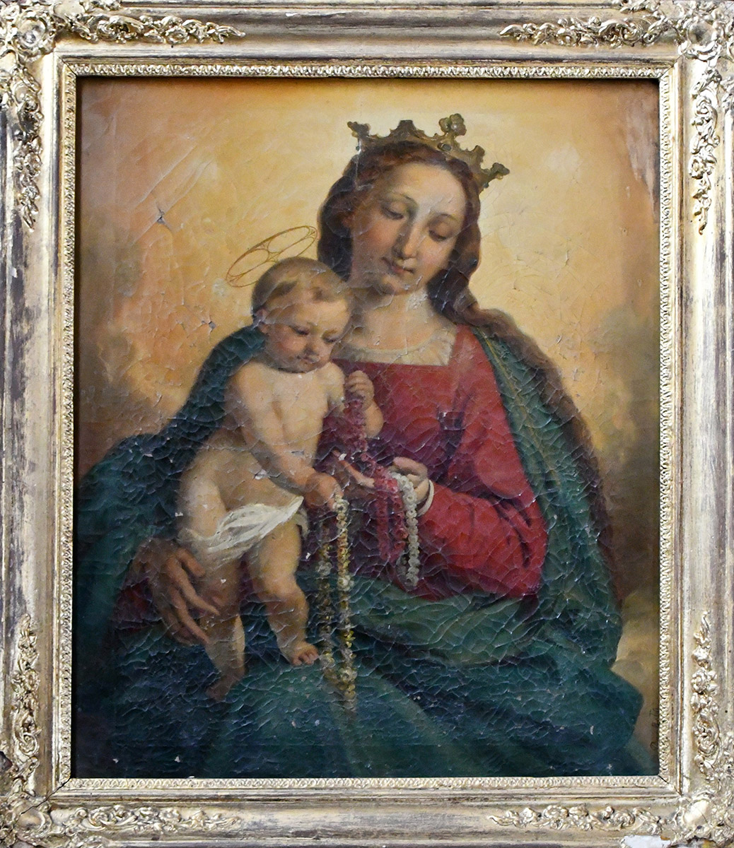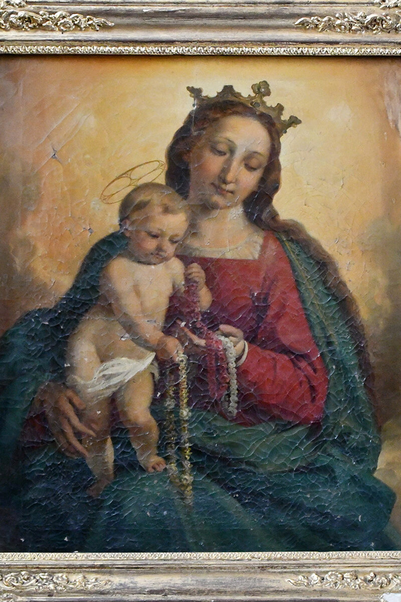 La mensa de l’autel présente également une image de la Vierge du Rosaire, peinte en 1860 par l’artiste viennois Josef Plank. Plank est aussi l’auteur de la représentation de la Vierge des Douleurs sur l’autel opposé. Sa palette de couleurs douces et l’expression tendre des figures approfondissent la résonance spirituelle de l’autel, qui invite à la réflexion sur la souffrance, la compassion et la foi profonde de Marie. Cet autel constitue un précieux exemple de l’art baroque précoce et un puissant témoignage de la dévotion mariale.
