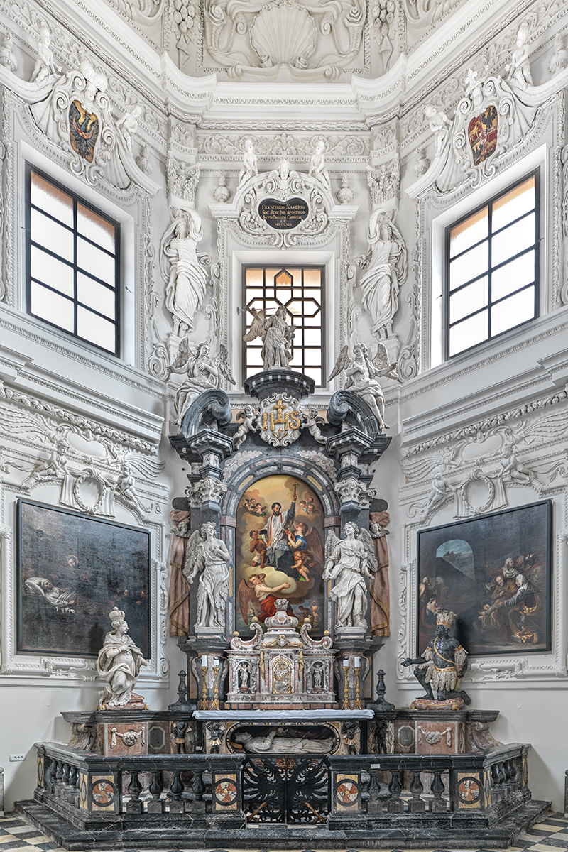 L’élément central est la mensa, soutenue par quatre figures de jeunes africains, sur laquelle repose l’image de saint François-Xavier en habit sacerdotal — non représenté en agonie, mais déjà défunt — en mémoire de ses reliques incorrompues, conservées à Goa depuis 1637.