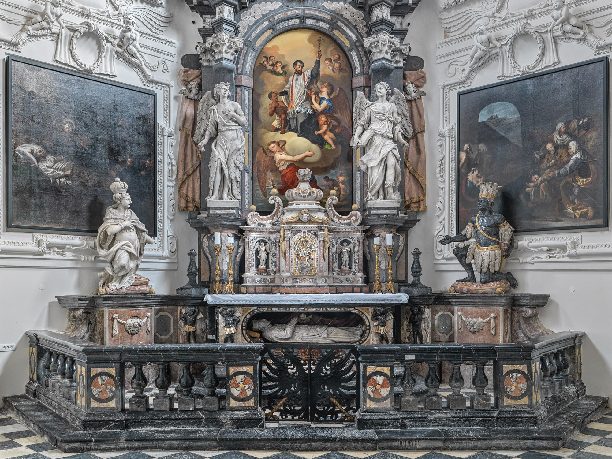 Unutrašnjost kapele upotpunjuje iznimno bogata umjetnička oprema. Monumentalni kameni oltar djelo je ljubljanske klesarske radionice Franca Grumnika, nastao između 1709. i 1720. godine. Krasi ga više od deset cjelovitih mramornih kipova talijanskih baroknih kipara. Središnja menza, koju nose četiri „crnačka” lika, sadrži kip sveca u svećeničkom ruhu, koji podsjeća na njegovo neraspadnuto tijelo čuvano u Goi. Uz njega stoje anđeli – seraf i kerub – djelo Paola Gropellija. Tabernakul su 1719. godine dopunila dva mramorna anđela u nišama, a 1720. godine dodani su i kipovi Europe i Afrike, djelo Jacopa Contierija. Na vrhu oltara nalazi se anđeo s trubom, koji je izradio Angelo Putti.