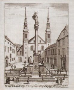 Ispred crkve uređen je Akademski trg s prepoznatljivim Marijinim kipom na visokom stupu. Marijin kip izliven je prema nacrtu polihistora Janeza Vajkarda Valvasora.