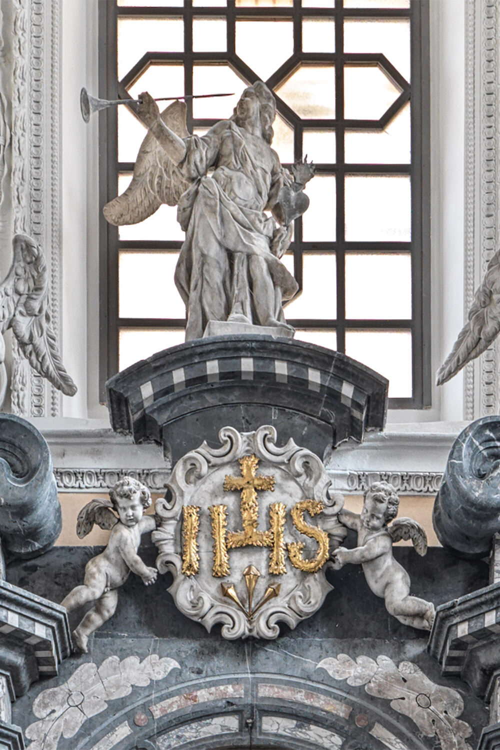 Przyczółek ołtarza zdobią dwa anioły siedzące na wolutach (dzieło Contieriego) oraz stojący anioł z trąbą na szczycie, wyrzeźbiony przez Angelo Puttiego.