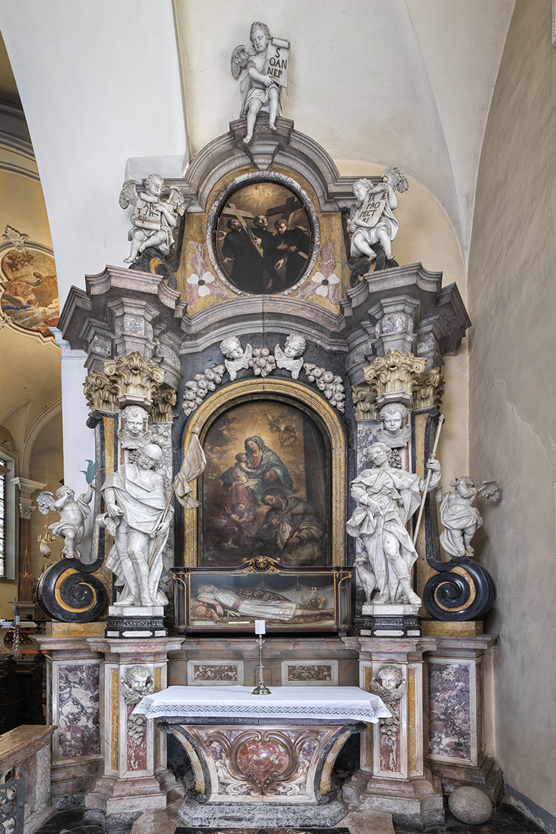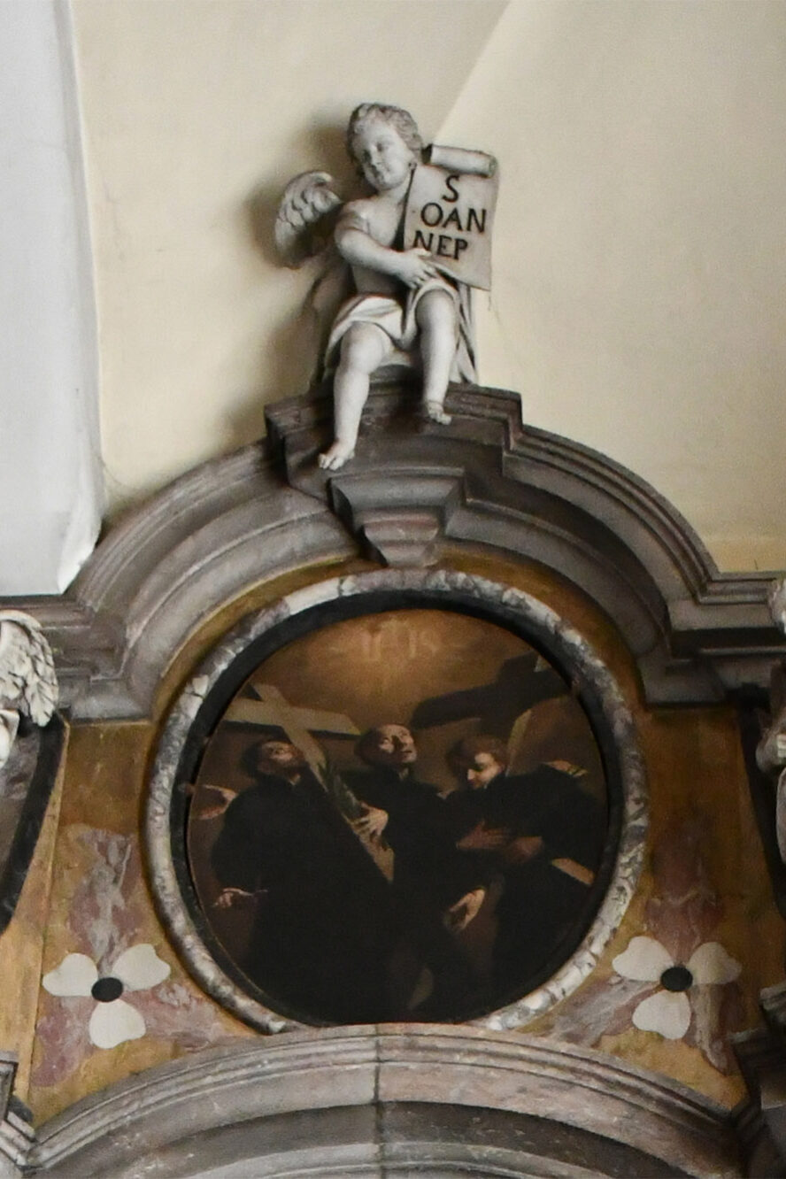 W attyce ołtarza znajduje się obraz Valentina Metzingera, przedstawiający męczenników jezuickich z Nagasaki (1597). Główna scena – Matka Boża ze św. Janem Nepomucenem – została wykonana w Wenecji w 1721 roku, prawdopodobnie przez malarza z pracowni Letteriniego.