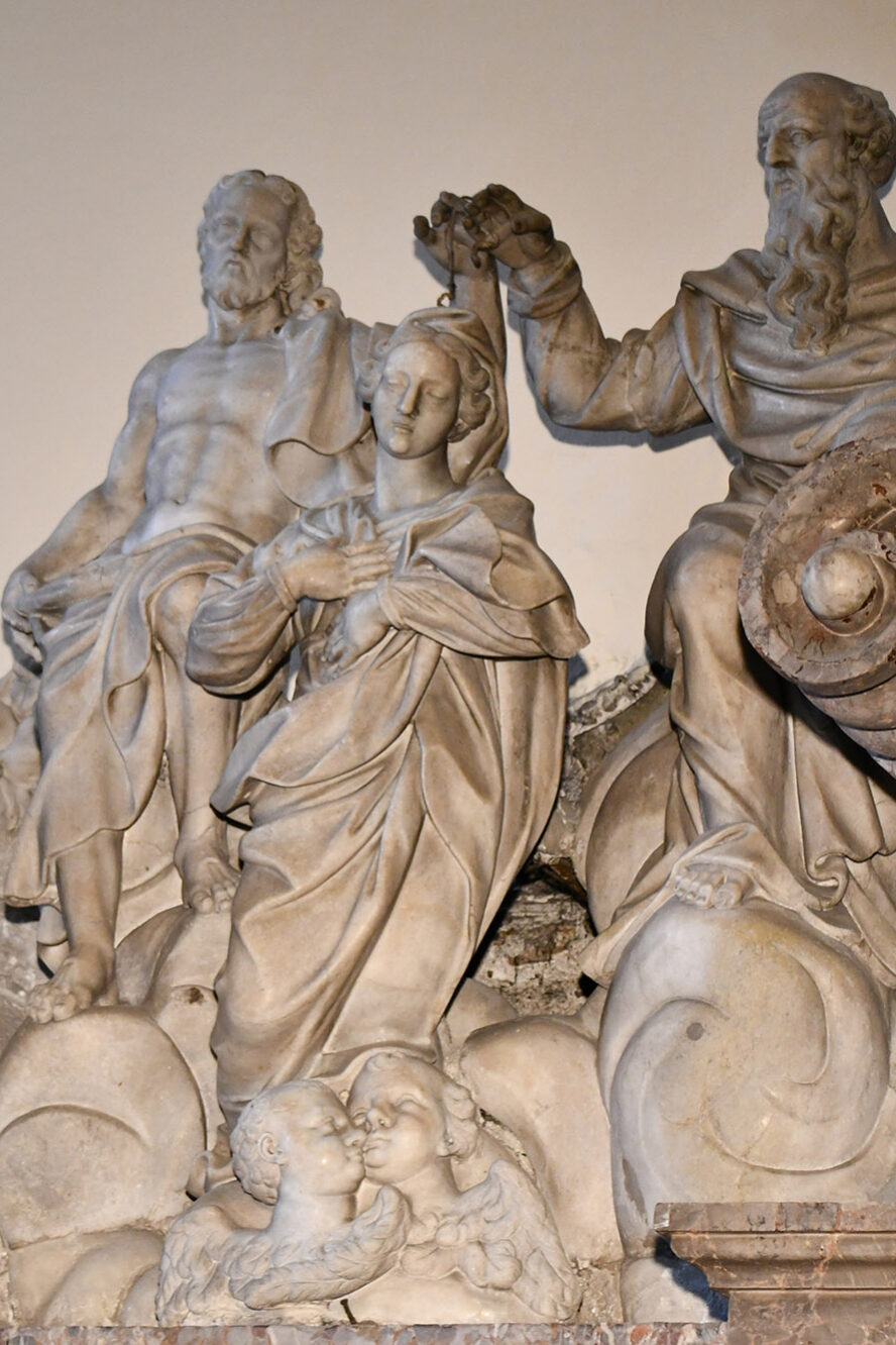 Autorem figur aniołów po bokach przyczółka również jest Contieri – trzymają one wstęgę z łacińskim napisem: