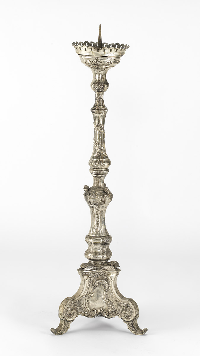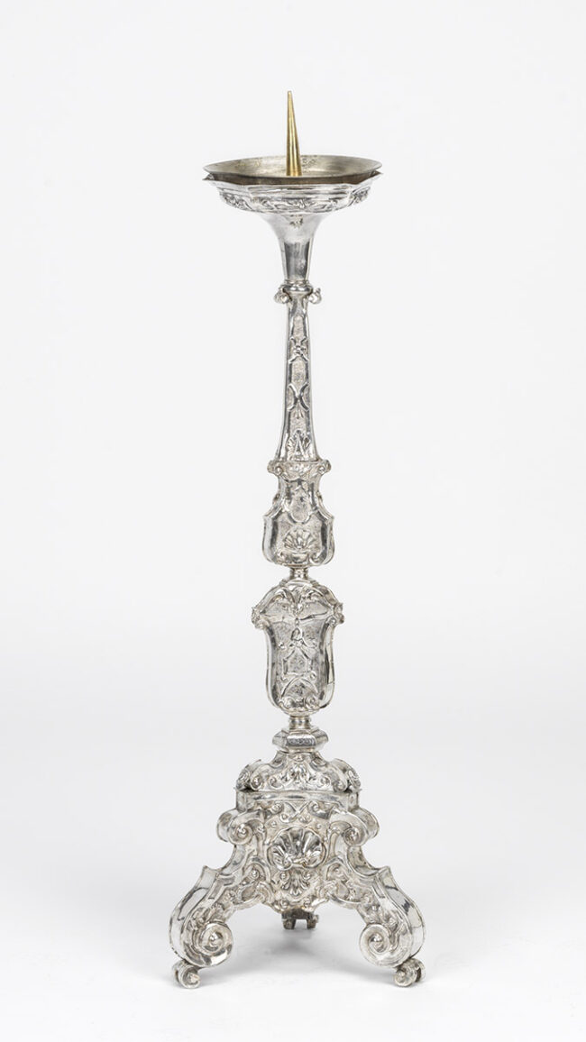 Podatki svečniku: Datacija: Prva polovica 18. stoletjaMaterial: Posrebrena pločevina, prešanaVišina: 80 cm Opis svečnika Ta elegantni svečnik iz prve polovice 18. stoletja je izdelan iz posrebrene pločevine in predstavlja izjemen…